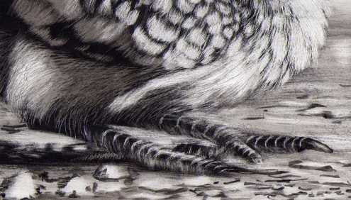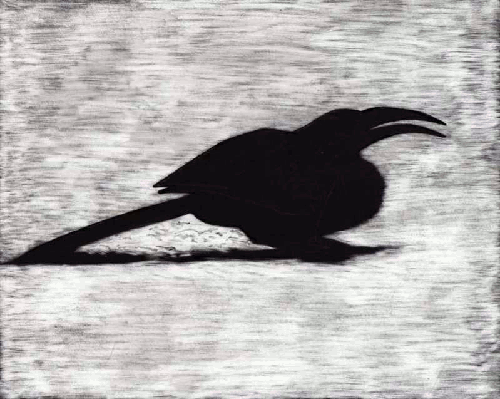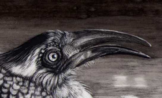 In this case I wanted to create a real sense of depth to my image so I used a variety of tools including sandpaper, fibre glass brush, scalpel, tungsten scribe, pen, coloured pencil (black) and diluted Indian ink, focusing everything into the middle where the actual bird is. I contemplated colouring it but since they don’t have a great deal of colour other than the red beak I decided against it as I kind of like the black and white look. It’s 8″ x 10″ and I’ve done an animated ‘gif’ to show the process through a few of the stages. I’m also showing a couple of close ups.