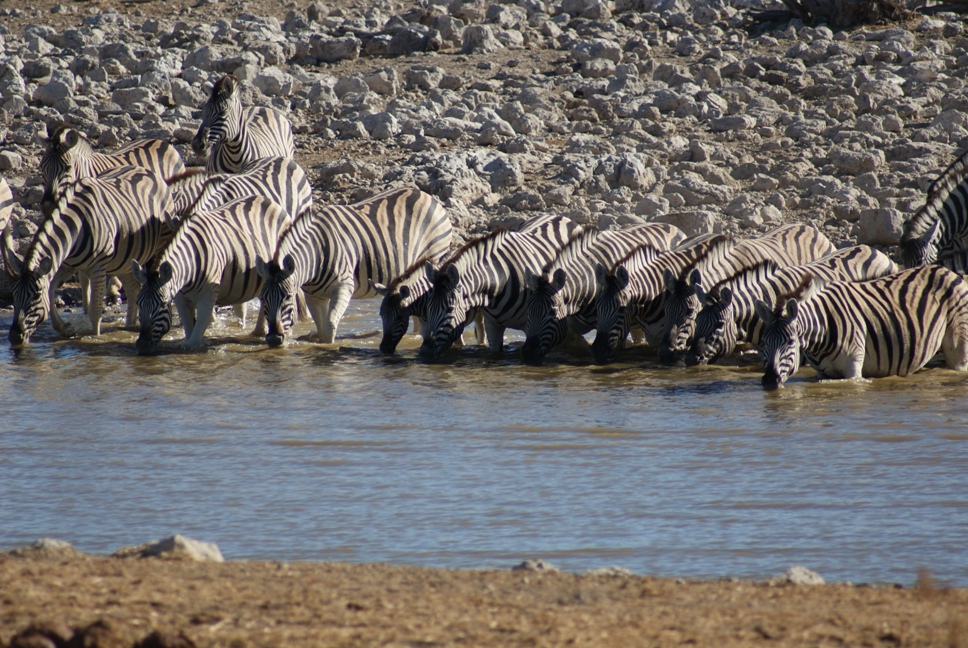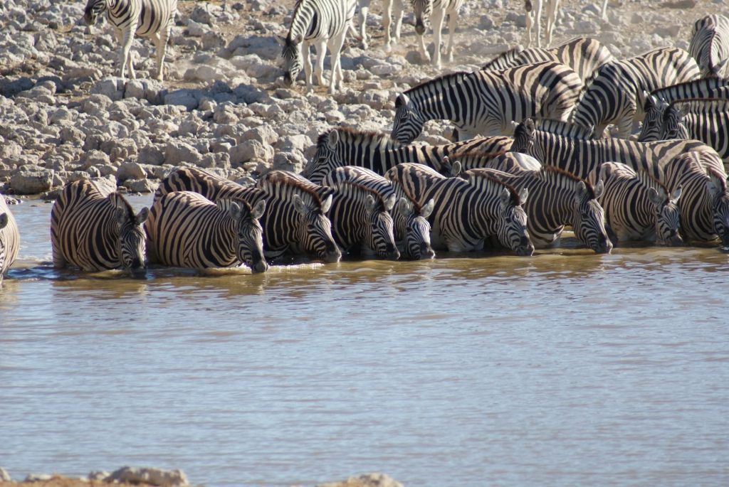 I’m being a bit flippant here since I like to work for my experiences but in truth, Okaukuejo gave me some incredible shots. Zebra would literally wade into the water with no fear of being attacked by crocodiles (since they don’t live in Etosha either) and line up to drink like the ones in the photo below.
