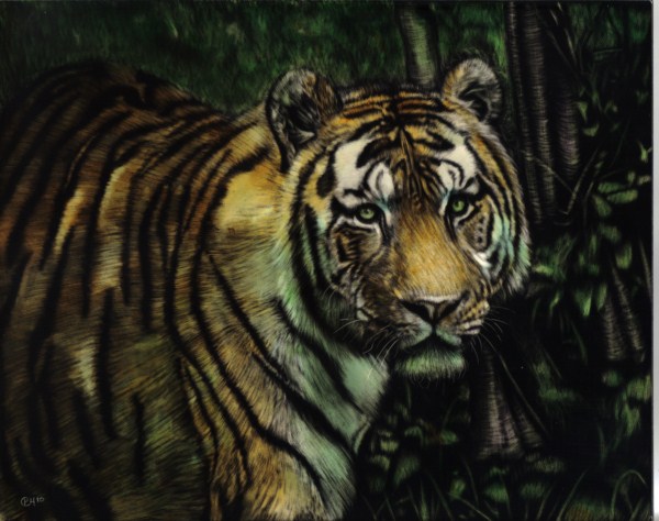 Although I’ve seen a lot of tigers in zoos, I’ve never seen them in the wild. The following two scratchboards came from meeting someone (whilst I was travelling last year) who had some great tiger reference material on his camera which he shared with me. That’s another serendipity of travelling, you get to meet people who have done things you haven’t done and you can benefit and learn from them.