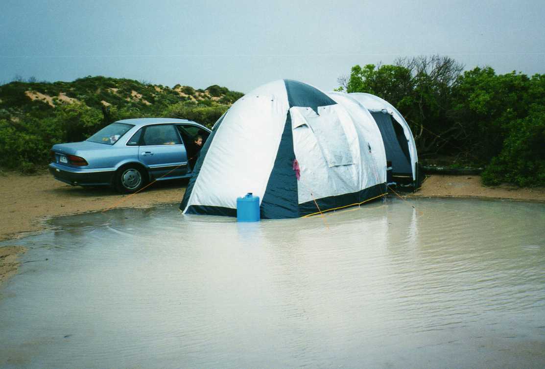 I took my family camping on a whale watching trip at the Great Australian Bight. We camped at Cactus beach and I found a perfect spot for the tent out of the wind. It didn’t look like it was going to rain but rain it did!! Buckets of it! In the middle of the night, our mattress seemed to be floating and when I could finally brave the elements, the rain had stopped and the water had subsided somewhat. This is our tent and the kids have never let me forget about it. The water was up to the car wheels earlier.