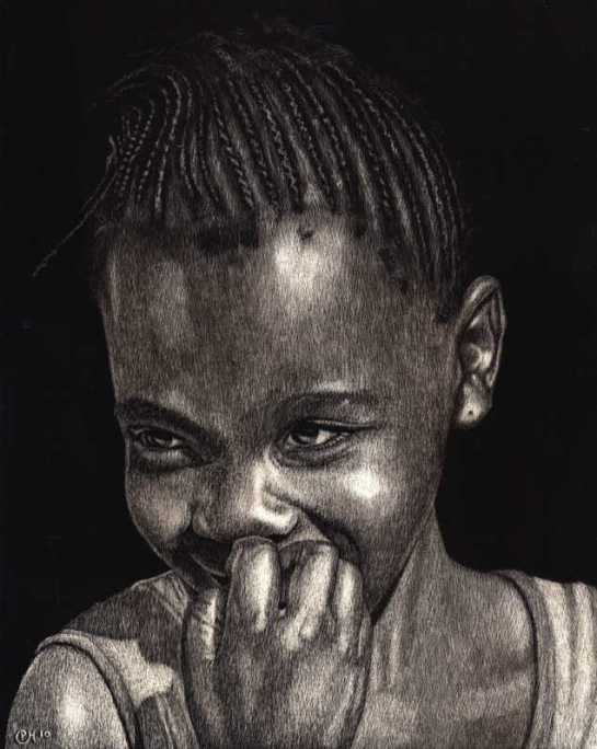 This scratchboard piece is the result of that encounter and I’ve called it “Demure Joy”, symbolising both reactions I saw from her that day.
