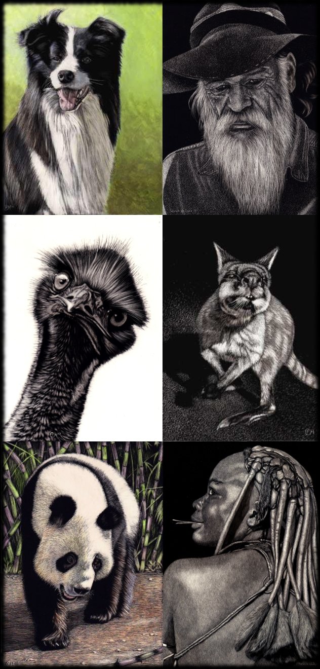 A group of us scratchboard artists are working through the process of establishing ISSA, International Society of Scratchboard Artists. The goals are to drive scratchboard into greater recognition as the fine art medium that it is, and to provide exhibitions and workshops around the world for scratchboard artists to show their work and to increase their education in the medium. There are many of us out there, thousands possibly, and there isn’t any entity representing us – until soon. Watch this space over the coming months for more information so if you wish to try your hand at scratchboard, there will soon be a good support system in place.