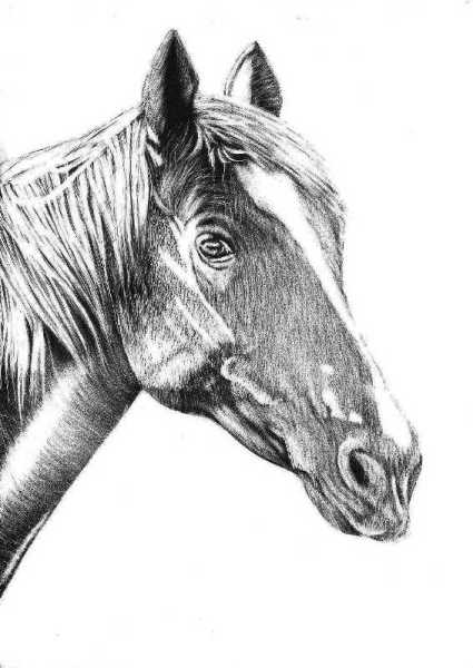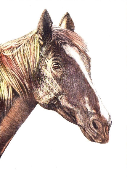 Recently I organised a large swap of scratchboard art. Twenty artists from the WetCanvas forum all got paired up and told each other what they want to receive. I asked for a primate and got a lovely colobus monkey, and I was asked for something equine so I came up with this horse. Scratchboard coloured with watercolours on the horse and oils on the sky and bushes. Just a small piece at 5×7