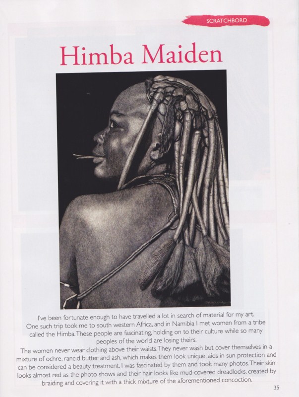 In the latest edition of Australian Fine Art and Decorative Painting magazine, I have a six page step by step demonstration of my Himba Maiden in scratchboard. If you are in Australia, grab an edition, it’s not expensive and a well printed magazine, it’s volume 18, number 11. If you are too far away, here’s a scan of the first page with the finished piece.