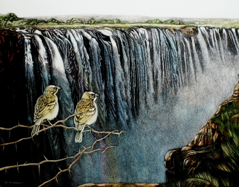 I don’t tend to do landscapes so much but I thought I really should try and push myself a little more in that direction, still with wildlife at the heart of what I do. In 2009 I was in Zimbabwe and Zambia where I saw the falls and these lovely birds. I’ve tried to show the lushness of Victoria Falls, a magnificent icon of Africa, with a hint of a rainbow, juxtaposed against the harshness of the tough life of the inhabitants, represented by the weavers’ natural habitat, this thornbush. It’s scratchboard coloured with Mastisse inks, 11″ x 14″ and I’ve used my fibreglass brush for the birds and a scalpel for the landscape done in my trusty squiggly style.