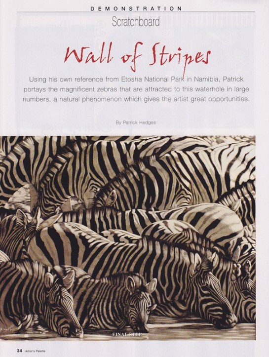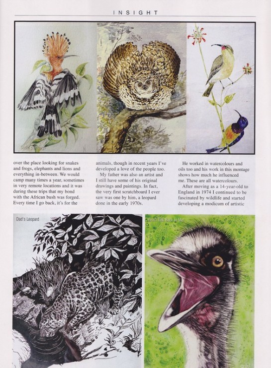Artists’ Palette magazine is an excellent source of inspiration so it’s a great honour to be included in the edition currently in the shops, issue #105. I have sixteen artworks published plus a demonstration of a zebra scratchboard. Also, there are four artworks by my dad in there. He was a huge inspiration to me and, despite losing him when I was thirteen, he showed me the way in life. His art was gorgeous and always represented those African animals that he loved so much. Below are a couple of pages from the magazine article including the page with the four pieces my dad did.