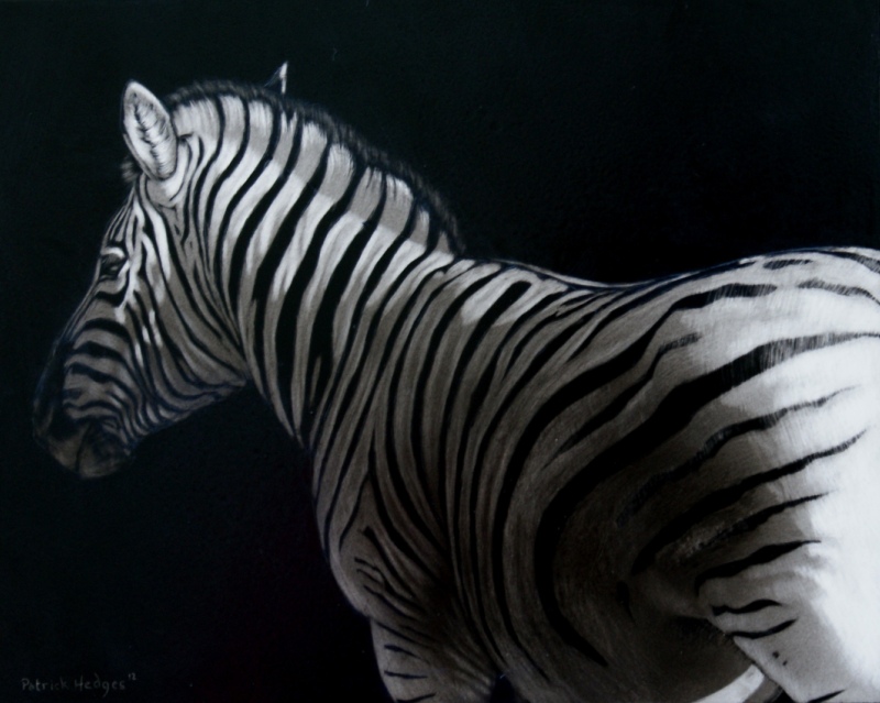 Sometimes you just have to do a quickie. This is a small (8″ x 10″) scratchboard of a zebra from one of my Africa trips. Simple process, do the drawing, remove all of the ink from the white stripes with a fibreglass brush so you are back to pure black and white, then use an airbrush (or use a large watercolour brush) to add a layer of diluted Indian ink over the whole thing, wait til it dries and use the fibreglass brush again to pull out some highlights. Repeat the ‘pushing and pulling’ process of airbrush and highlights until you have the desired 3D roundness you need to make the zebra look like you want it to look.