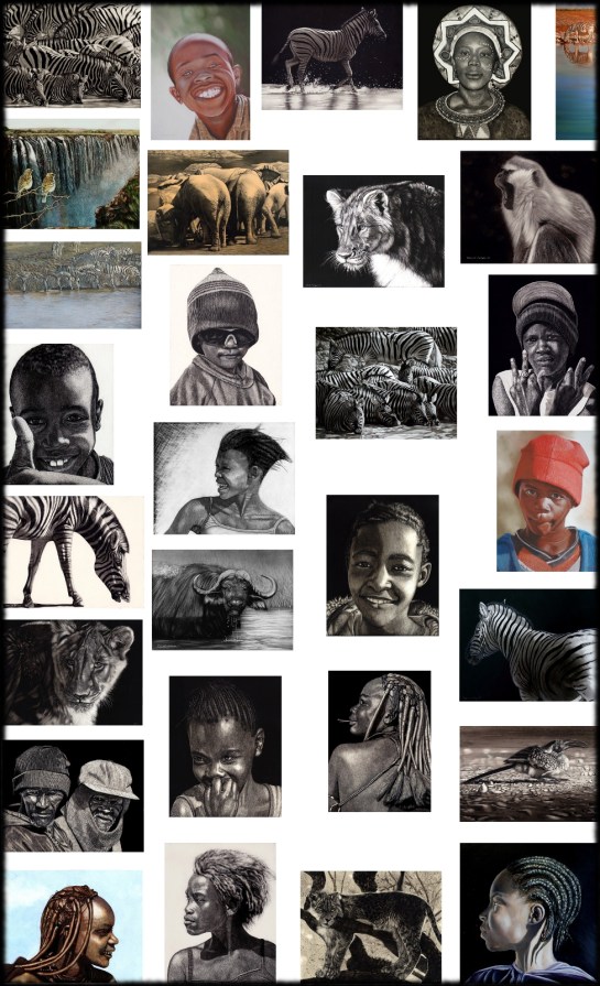 I was recently looking through my art (which is all carefully catalogued on my computer and in various other safe havens) and it struck me that my trip to Africa in 2009 was amazingly successful in generating ideas and references for my work. It was my sixth trip back home since I left at the age of fourteen but for some reason, this one made such an amazing impression that all this art poured out of me. One thing that definitely contributed was that this was the first time I had taken a really good digital SLR so not only could I keep clicking away, but I could also get in really close. I have compiled all of the pieces I’ve done from that one trip into the image below. It really is quite incredible how some travels affect you more than others and that trip was a corker!! It was through six different southern African Countries, seeing the most incredible sights. So here is a pictorial record of hundreds of hours at the desk or easel. The montage was thrown together pretty much willy-nilly but it gives an idea of how good that trip was. The scale of each image is not relative, some are much bigger than others in real life. There are three different mediums represented – scratchboard, pastels and oils.