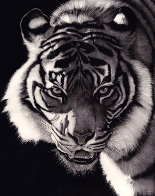 This is a 20″ x 16″ scratchboard and is created by using 80% fibreglass brush, 15% steel wool to get the backlit areas and 5% blade to get the whiskers and hairs at the edge. In reality there were no highlights in the eyes but I used artistic license to add more life. She is a magnificent animal and I really hoped to convey a sense of drama with her as if to say “You come one step closer and you’re mine”!