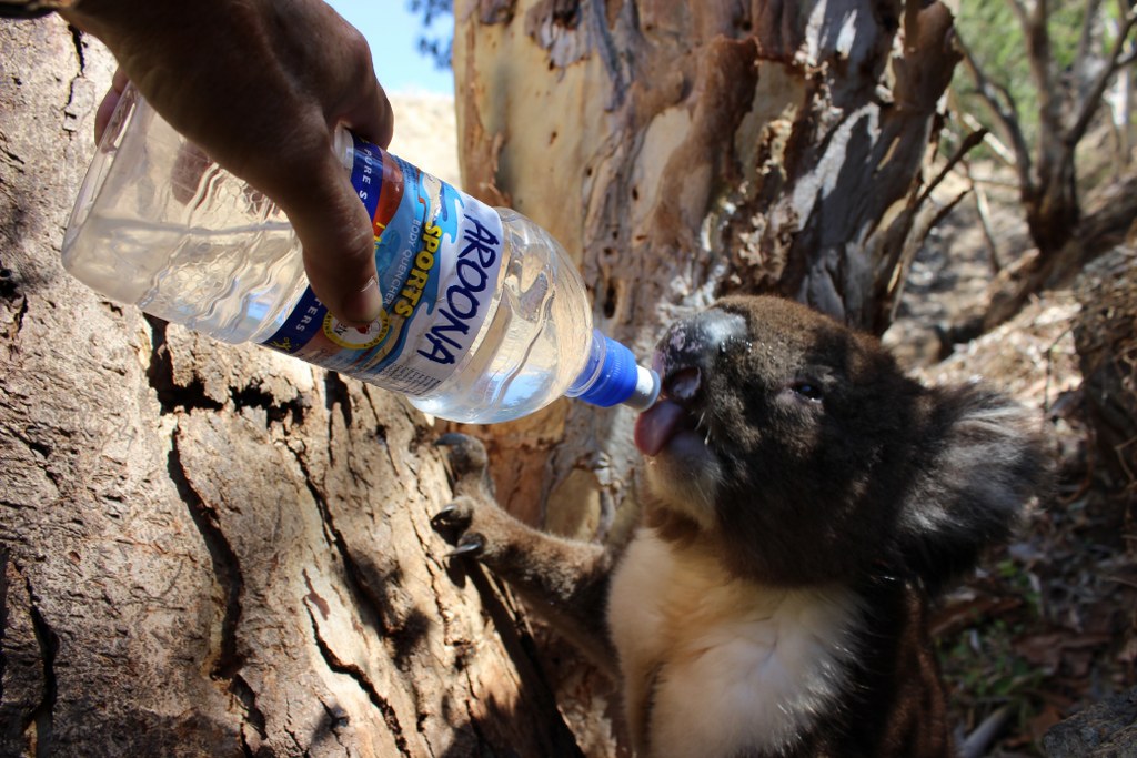 I left the area to finish the first part of my walk and when I got back about an hour later the same koala was back at the bottom of the tree. This time I approached very slowly and it climbed only to my waist level and stopped. I stopped too, sat down and waited a while. I also talked reassuringly. It looked very hot and parched so I took my water bottle out and gingerly advanced a few more steps, sat down, waited some more, advanced a bit more again until I was eventually within arm’s reach. I held out the water bottle and poured a few drops onto the ground so the koala could see what it was. I then leaned in and poured some water onto its nose and straight away it started to drink. It eventually drank about half my remaining water and at one time it even took the bottle off me but then dropped it. I was a wonderful experience and it even let me pet it a little. I shouldn’t have but simply couldn’t resist it. It’s great when an animal trusts you enough to allow you this close and to hopefully even help it. I’ve seen this koala up the same tree once before so it’ll be interesting to see what happens if I ever see it again. Check out the following photos.