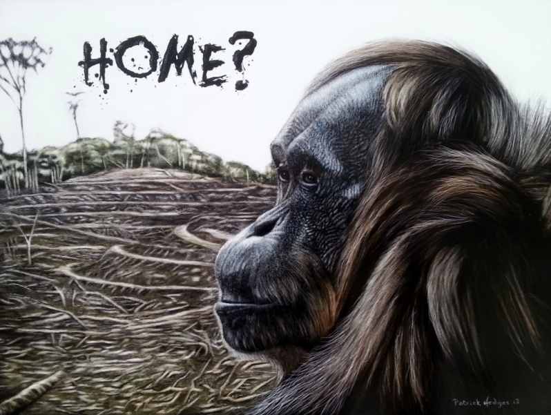 In the Frankfurt Zoo I saw this orangutan and coupled with West Africa’s lack of wildlife (displaced, destroyed or eaten) and the orangutan’s own Indonesian issues with homeland being decimated to make way for our insatiable urge to produce palm oil, I created this protest piece.