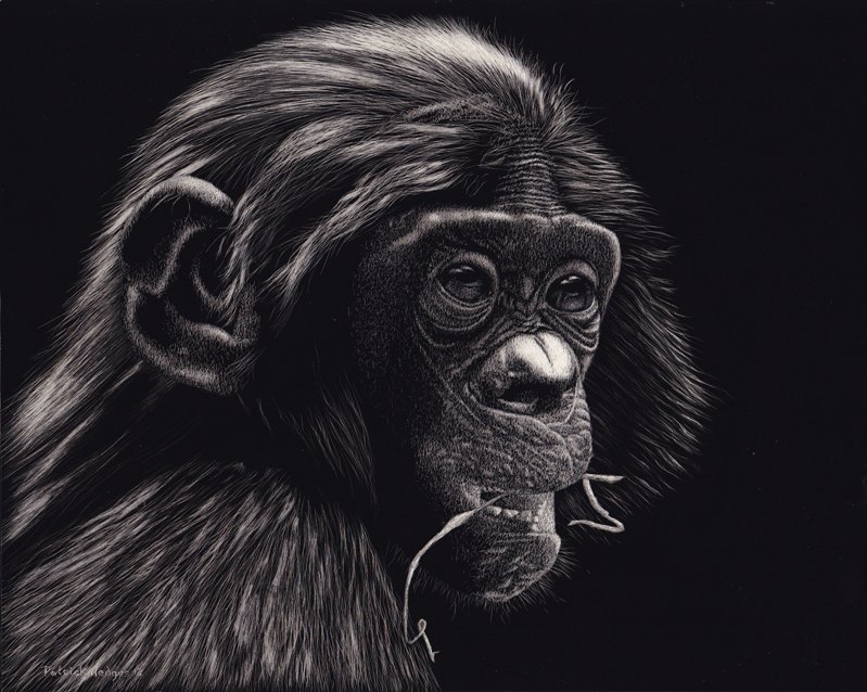 Unfortunately my camera display had been broken by a clumsy x-ray operator in Frankfurt airport going from one section to another, so at the zoo I had to simply click away and hope something was happening, since I couldn’t see the results on the screen (or apply any special settings) so it was a nice surprise when I got home and saw some awesome photos to work from. The following two pieces are a ‘variegated spider monkey’ and a ‘bonobo’ and there will be more to come from this visit. I need to get ready for an exhibition at the Adelaide Zoo with another artist, the amazing Kerryn Hocking, so I’ll be doing as many wildlife pieces as I can before tackling some portraits from Benin with the rich cultural history that can be found there.